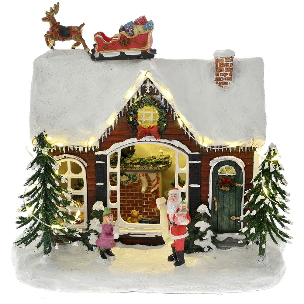 Χριστουγεννιάτικο εντυπωσιακό φωτιζόμενο σκηνικό με σπιτάκι Αι Βασίλη με έλκυθρο στην σκεπή. Εχει φωτάκια σε αρκετά σημεία. Δεν έχει μουσική. Λειτουργεί με μπαταρίες 3ΑΑ που δεν περιέχονται.