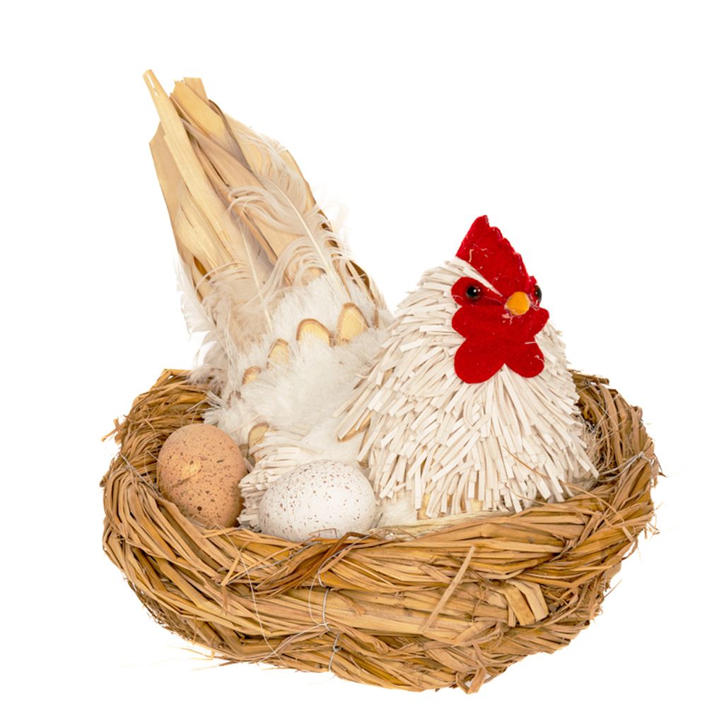 Κότα λευκή καθιστή σε φωλιά με αυγά 32χ25 χ22εκ.διακοσμητικη.