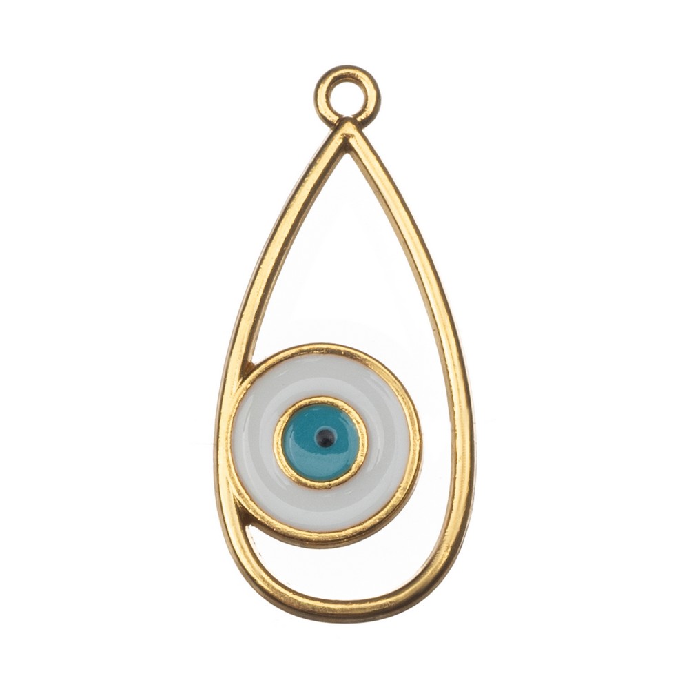 Μεταλλικό στοιχείο ματιού σε σχέδιο σταγόνας, με λευκό και γαλάζιο σμάλτο.Ιδανικό για γούρια, μπομπονιέρες, εποχικές κατασκευές και χειροποίητα δώρα.Ελαφρύ και εύκολο στην τοποθέτηση σε κορδόνια, αλυσίδες και συνθέσεις.