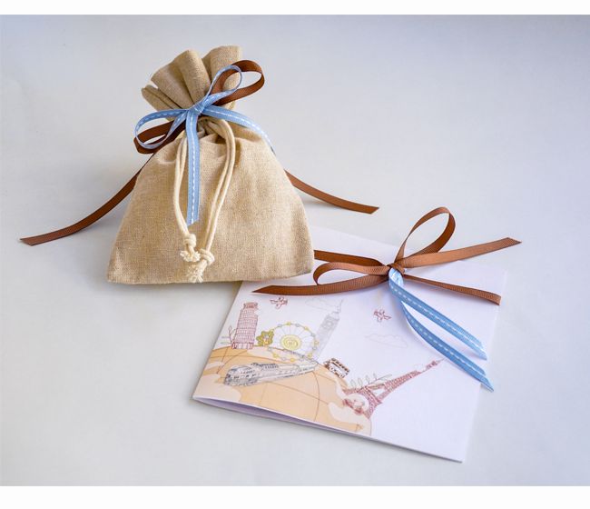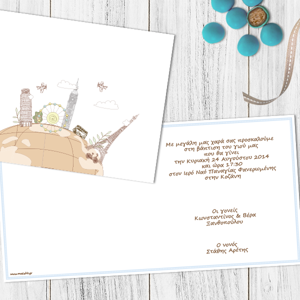 Προσκλητήριο Βάπτισης δίπτυχο “Ο Γύρος του Κόσμου” από λευκό χαρτί οπαλίνας 300γρ