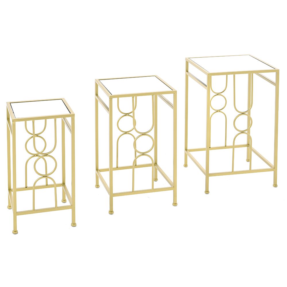 Μοντέρνο μεταλλικό τραπέζι σετ των τριών τεμαχίων και διαστάσεων 35x35x60, 30x30x55 και 25x25x50εκ. Έχουν τετράγωνο σχήμα με χρυσό πολυτελές φινίρισμα και η επιφάνειά τους είναι γυάλινη. Ιδανικό για να